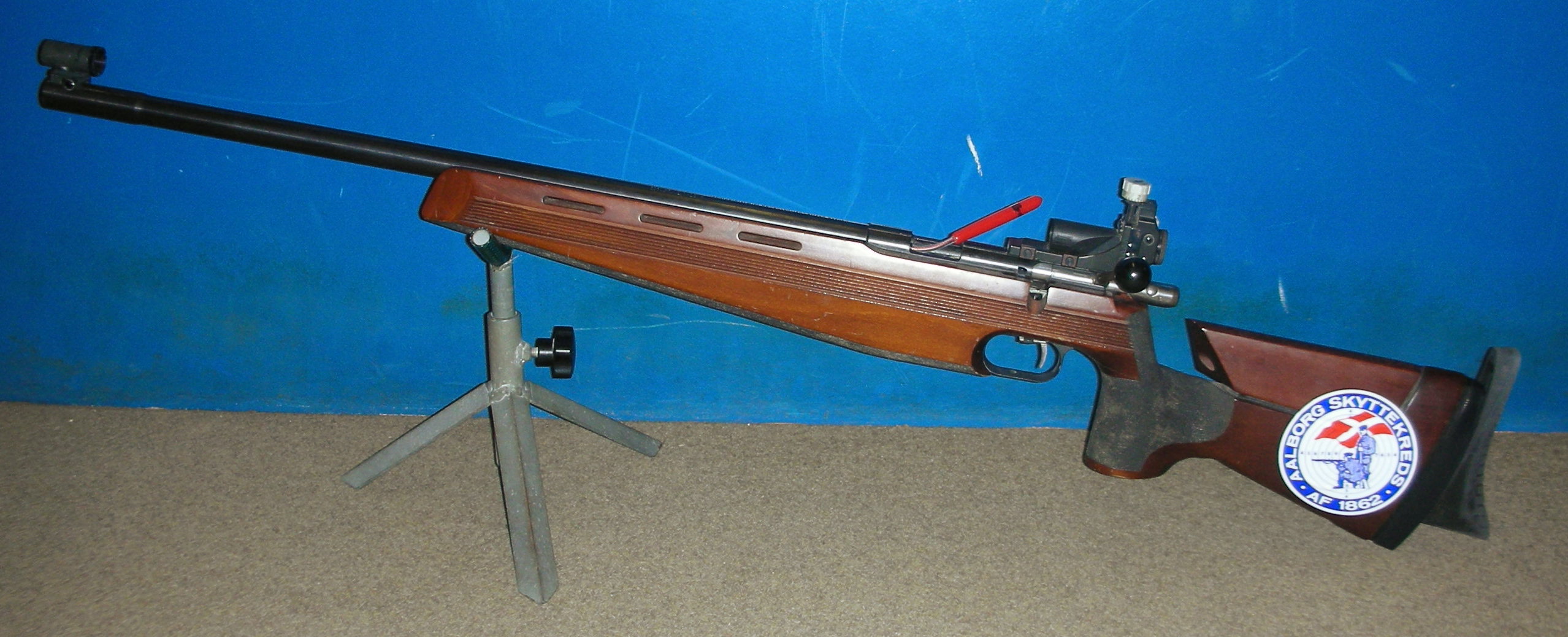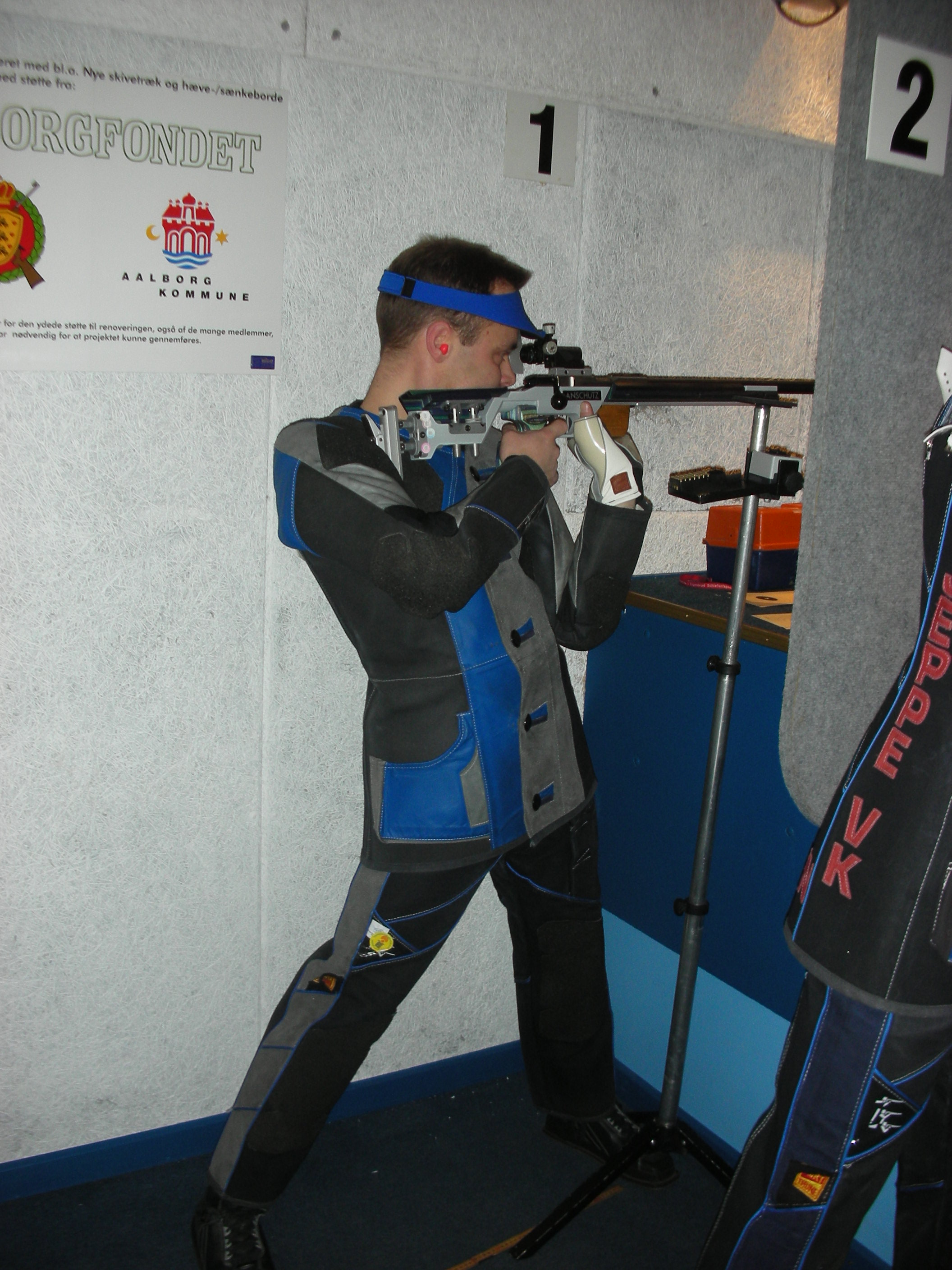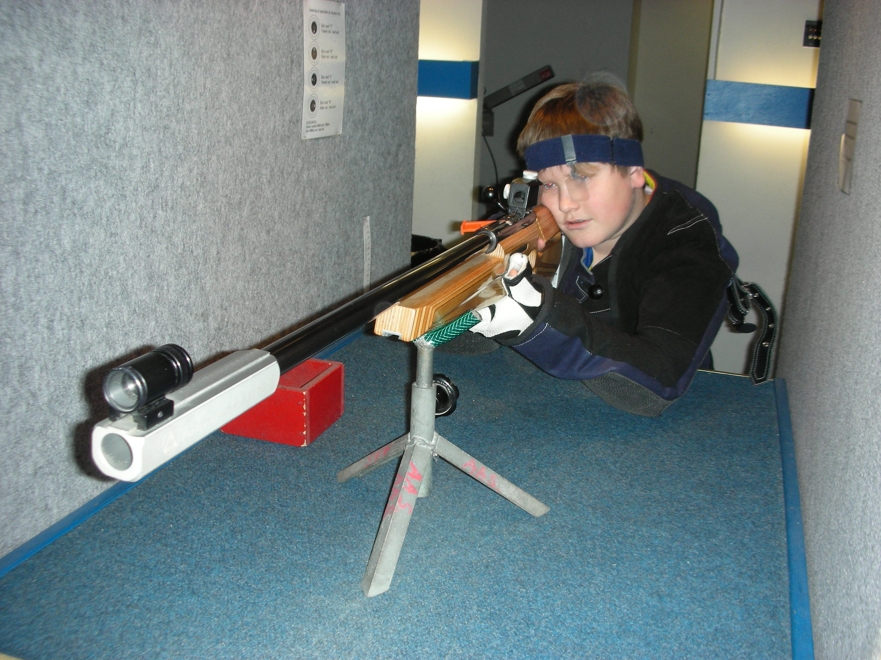Børn skyder stående med geværstøtte. Der kan anvendes en skydejakke, men det er ikke noget krav.